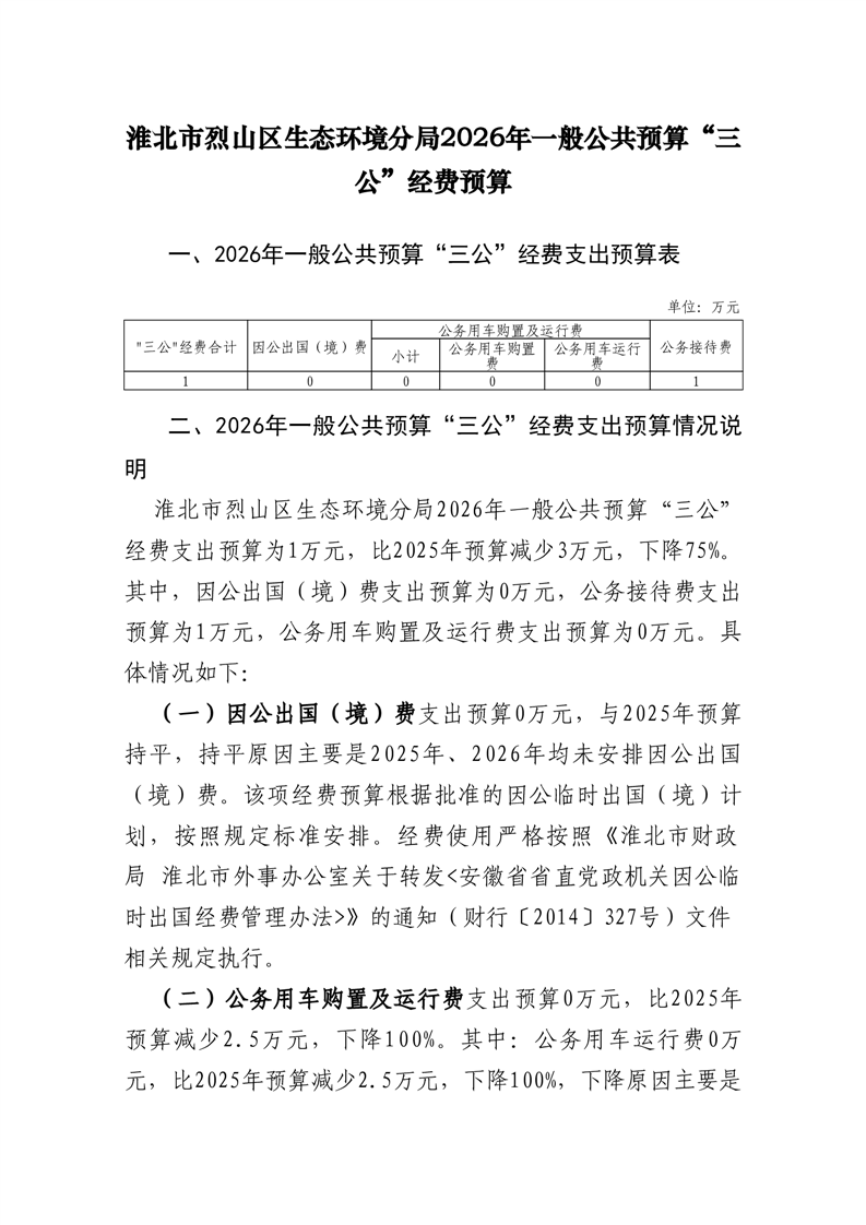 淮北市烈山区生态环境分局2026年度单位一般公共预算财政拨款“三公”经费预算情况说明